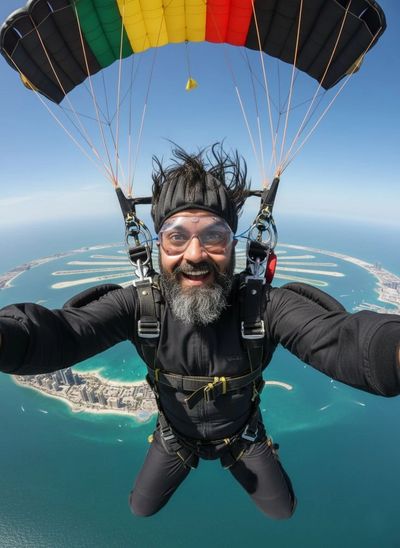 Ultra-realistic wide-angle selfie photo of a man (attached photo, 100 percent face reserved) skydiving high above the Palm Jumeirah, Dubai. The subject wears a black jumpsuit with secure parachute harness and transparent protective goggles. His hair is blown upward by the wind, expression joyful and excited. The parachute straps and lines are visible above him. Below, the iconic artificial palm-shaped island is clearly seen surrounded by turquoise waters and white sandy edges.
